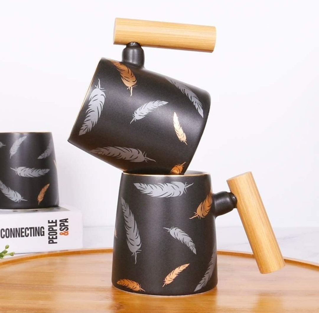 Nordic Feather Ceramic Mug Set with Bamboo Tray – 9 Pcs