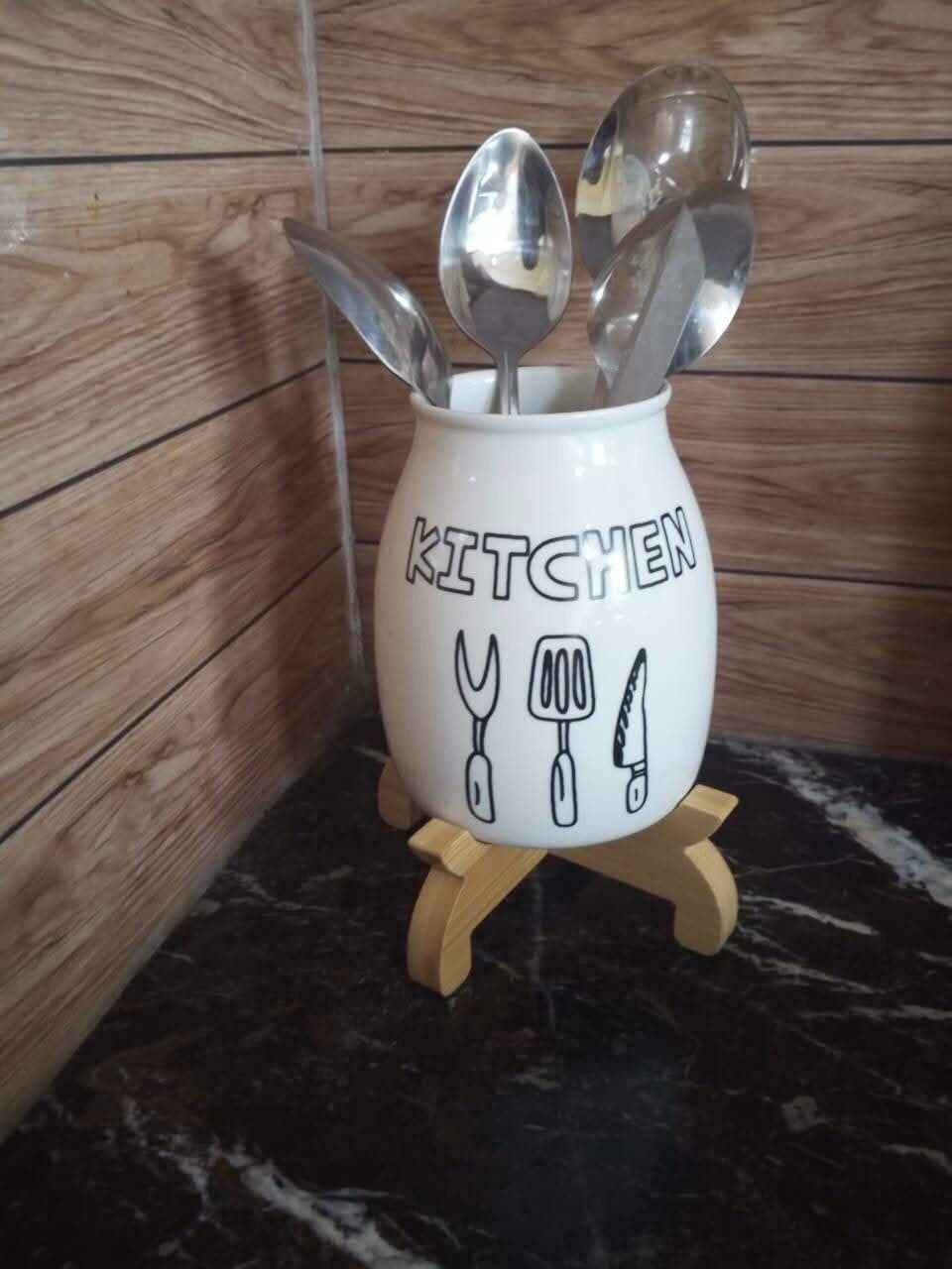 Kitchen Utensil Ceramic Holders Bamboo Stand | Kitchen Utensil Holder-1pc & 3pc | Decorative Ceramic Jars For Kitchen
